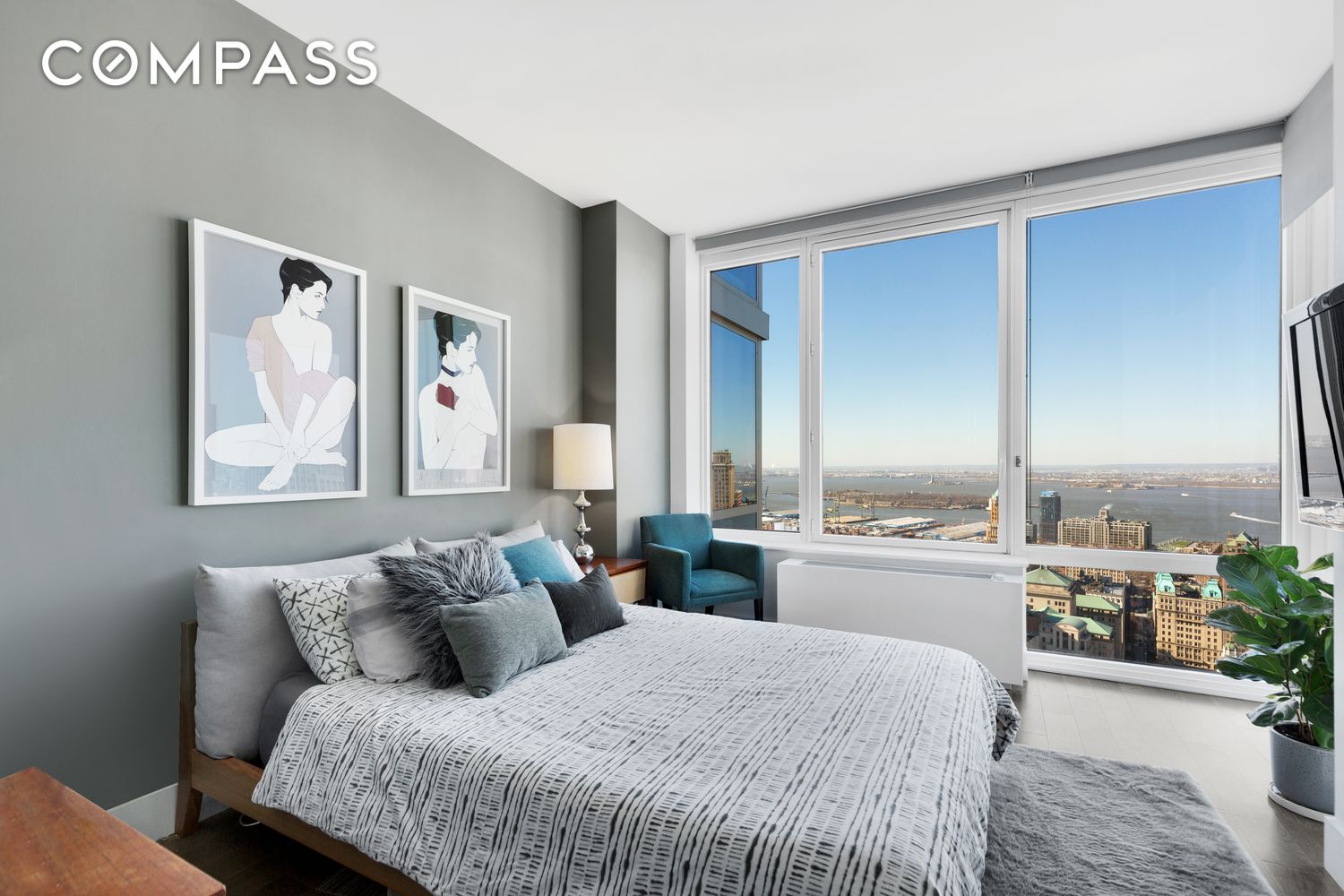 This spacious two-bedroom, two-bath condo residence is now available for rent--unlock all the benefits of luxury condo living in the sky. Perched high above the city with breathtaking panoramic views of the Manhattan skyline, New York Harbor, and the Statue of Liberty, this home is bathed in natural light through sixteen oversized windows and offers northwest exposures from every room, including direct views of the Empire State Building and One World Trade.